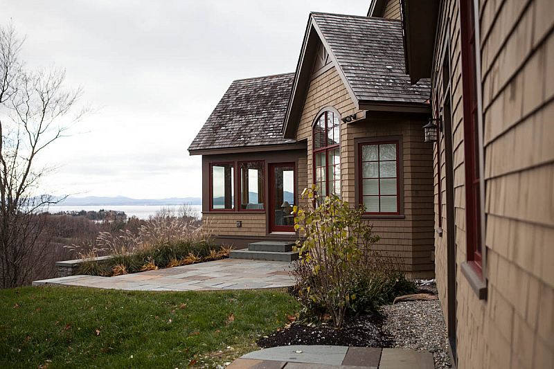 The construction of Hill Crest offered unique challenges due to the steep and rocky terrain of the building site. Using a cut and fill approach, the site was sculpted to maximize the spectacular views of Shelburne Farms and the Adirondack mountains. Hill Crest has many interesting architectural features: vaulted curved wood ceilings, a beautiful outdoor room with a spectacular stone fire place, and subtle touches like the flared roof eves. JB Construction, Inc is extremely proud of attaining the four-star energy rating, making this one of our most environmentally efficient homes.